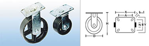 Колеса большегрузные из чугуна поворотные, платформенное крепление. Подшипник — роликовый, смазанный долговечной смазкой.