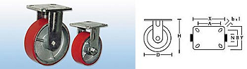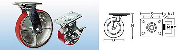 Колеса большегрузные поворотные и поворотные с тормозом, чугунный обод, полиуретановый контактный слой, платформенное крепление. Подшипник — роликовый, смазанный долговечной смазкой.