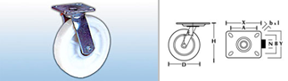 Колеса большегрузные неповоротные, обод — высокопрочный пластик, полиамидный контактный слой, платформенное крепление. Подшипник — шариковый, смазанный долговечной смазкой.