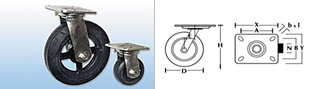 Колеса для тележек большегрузные обрезиненные поворотные и поворотные с тормозом, чугунный обод, шинка из литой черной резины, платформенное крепление. Подшипник — роликовый, смазанный долговечной смазкой.