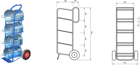 С помощью данной тележки можно перевезти 4 бутылки с водой по 19 литров. Благодаря оригинальному каркасу тележка легкая и жесткая и перевозить бутылки может один человек. Конструкция позволяем ставить тележку вертикально.